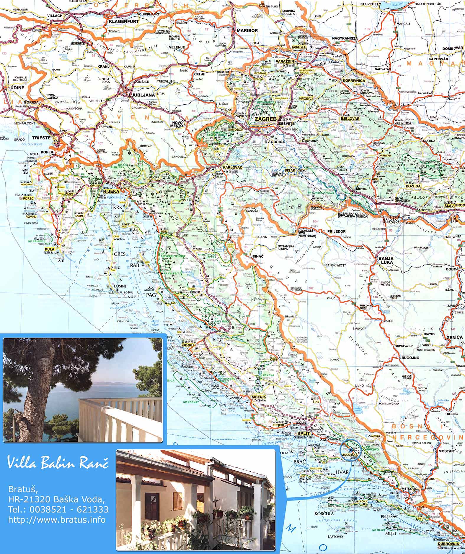 Über Graz auf der A9 Phyrn Autobahn hinter Spielfeld nach Slovenien. Dort auf der A1/A 4/B 9 nach Kroatien. Dort auf der A2 Richtung Zagreb und von dort auf die A1 Richtung Split/Dubrovnik bis zur Ausfahrt Šestanovac. Von dort über Gornja Brela hinunter zur Makarska Riviera. Weiter wie beschrieben.